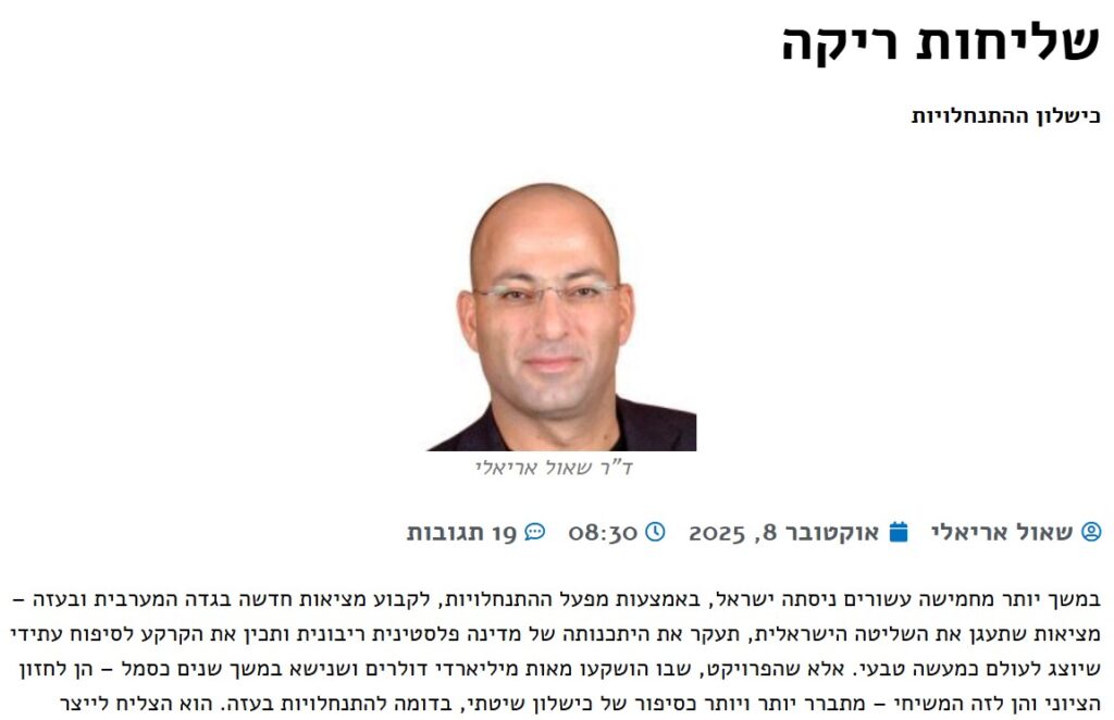 אל”מ(מיל) ד”ר שאול אריאלי: מפעל ההתנחלות של יהודים ביו”ש נכשל – 1.9.25